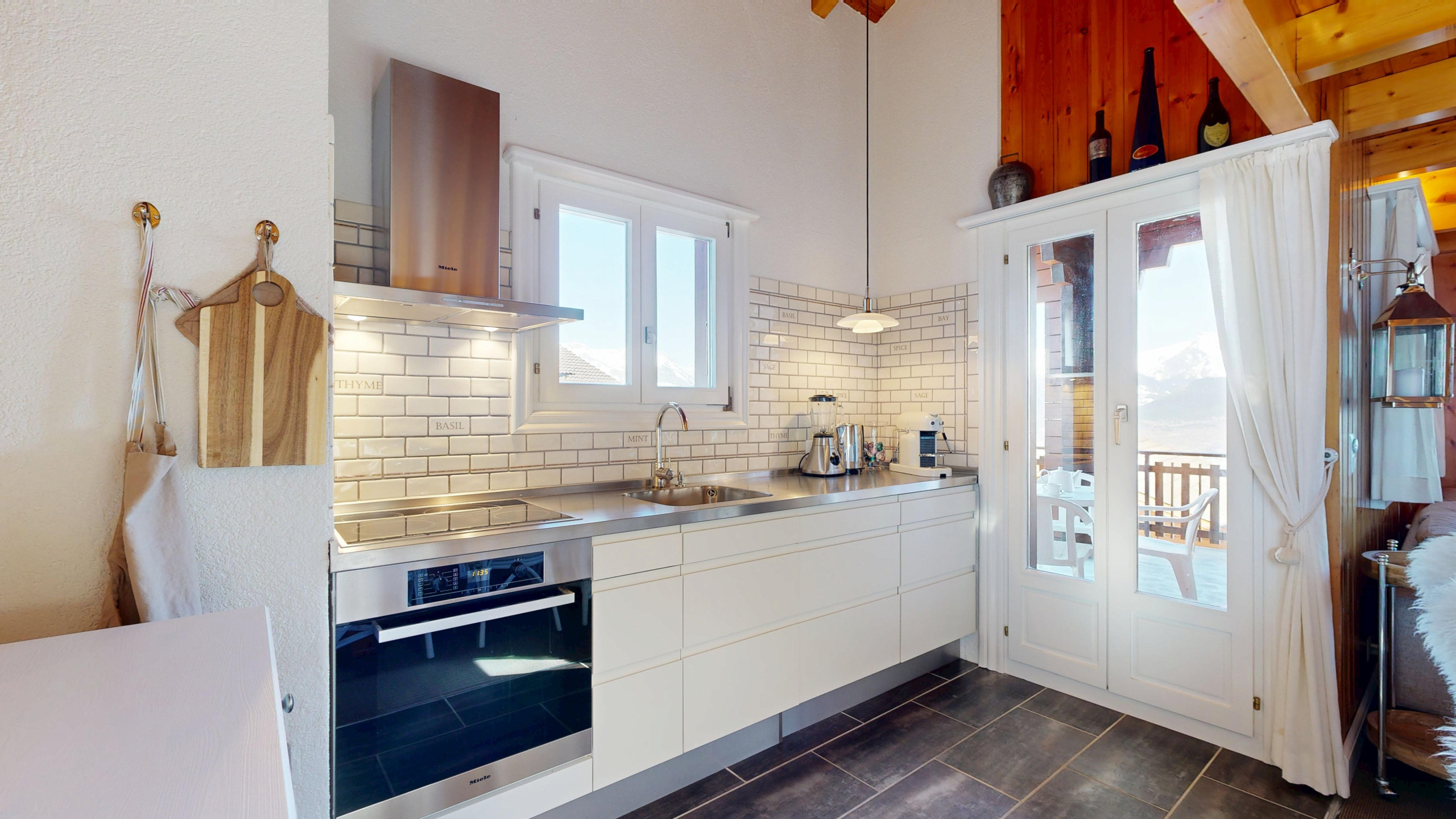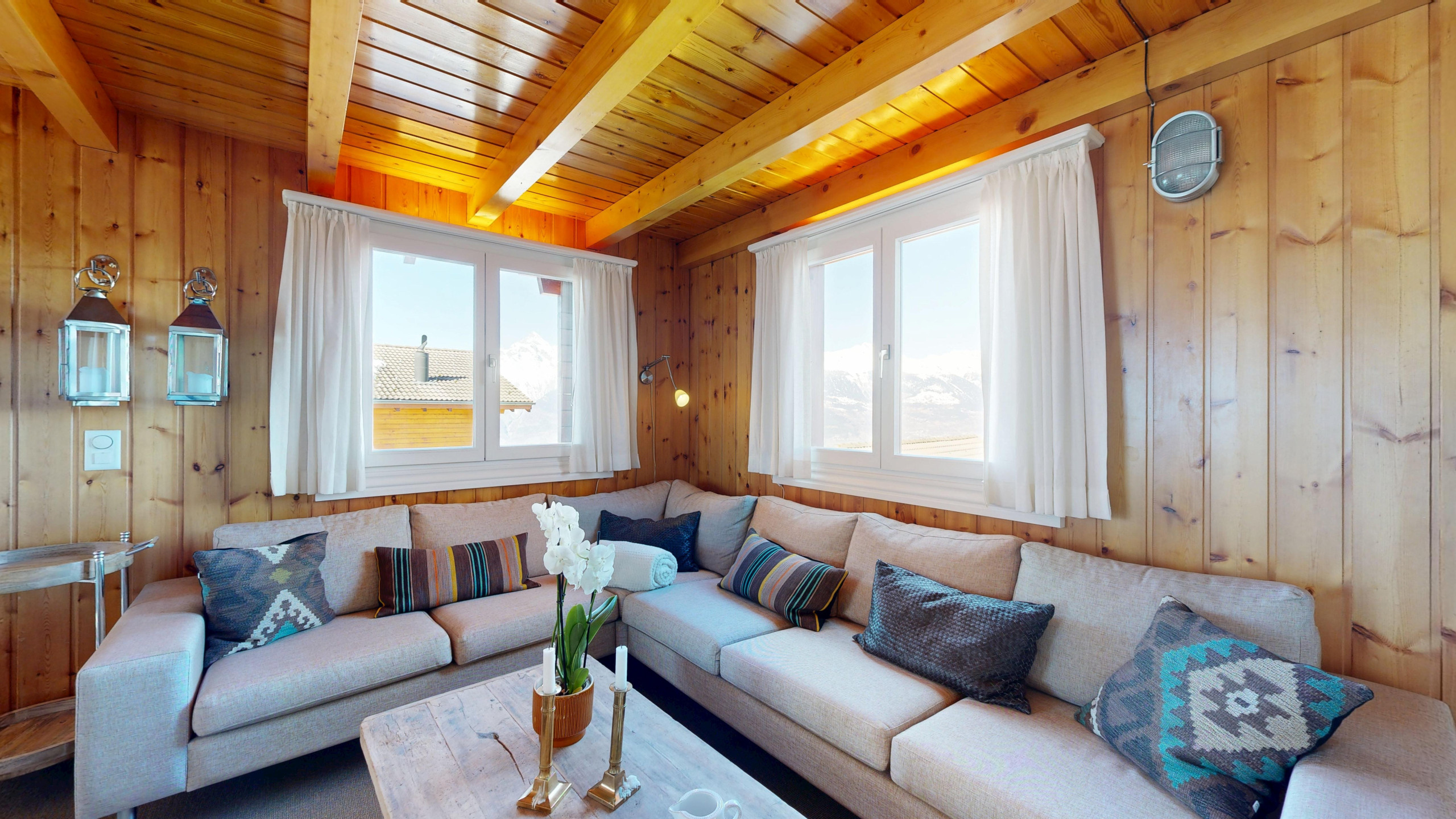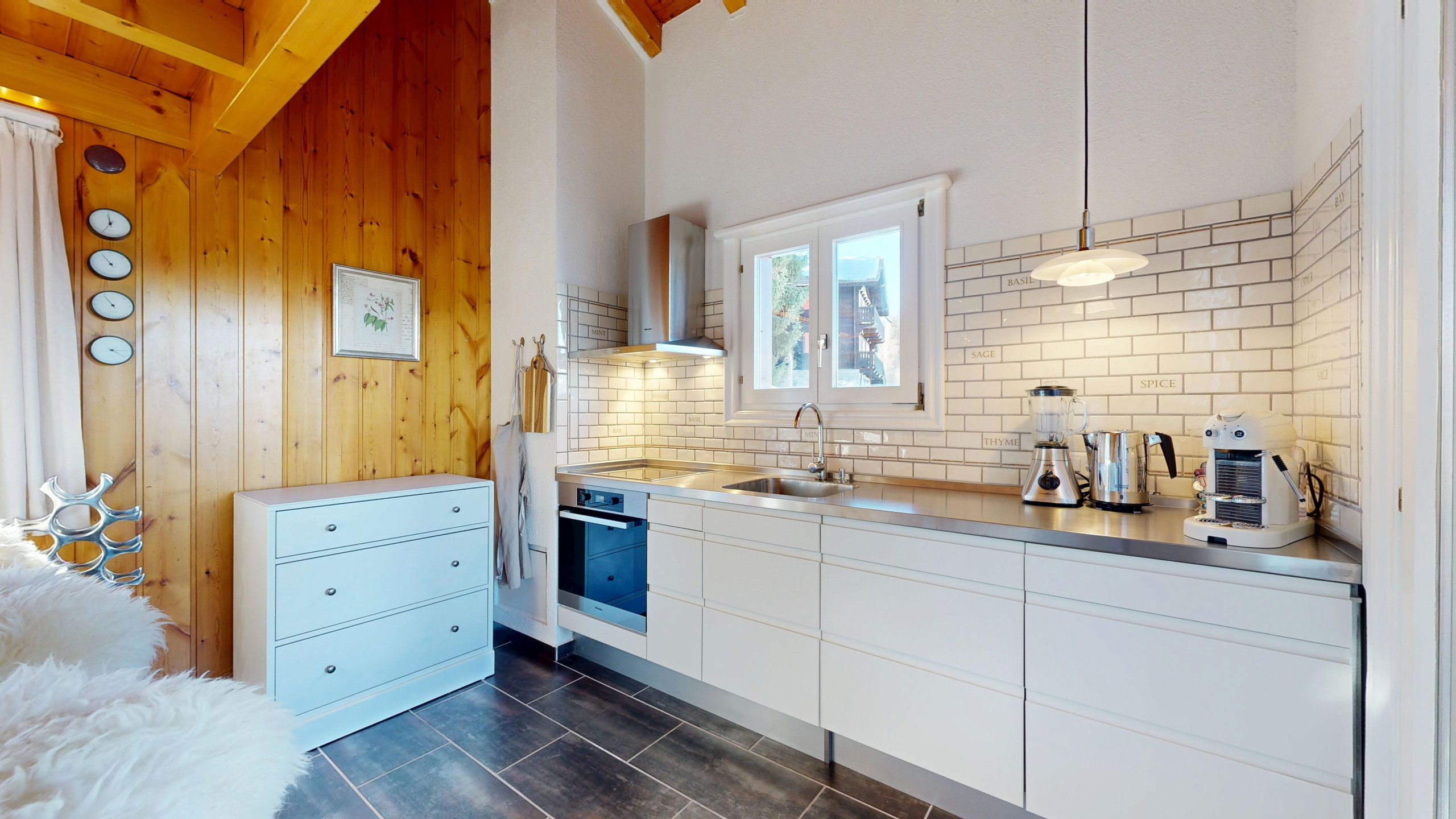 Chalet mit 6 Zimmern, 3*, für 10 Personen. Helles Wohnzimmer mit Fernseher und WLAN. Offene, ausgestattete Küche mit Glaskeramikkochfeld, Kühlschrank, Backofen, Nespresso-Kaffeemaschine, Geschirrspüler und Wasserkocher.