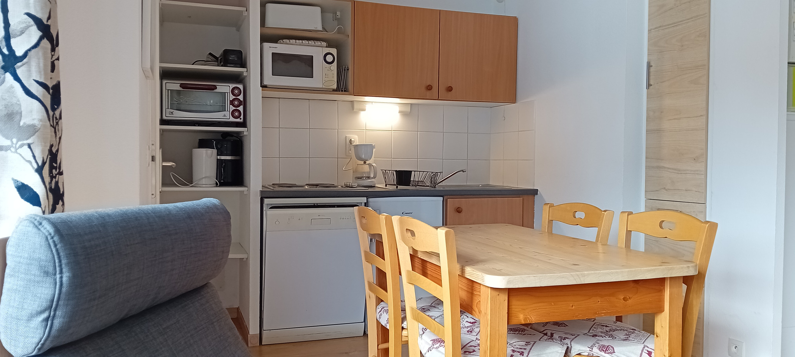Komfortable 3* Wohnung von 28 m2 im ersten Stock. Im Sommer sonniges Wohnzimmer, Flachbildfernseher. Offene Küche mit Induktionskochfeld, Kühlschrank (ohne Gefrierteil), Geschirrspüler, Senseo-Kaffeemaschine und Filterkaffeemaschine, Wasserkocher, Mikrowelle und Toaster.