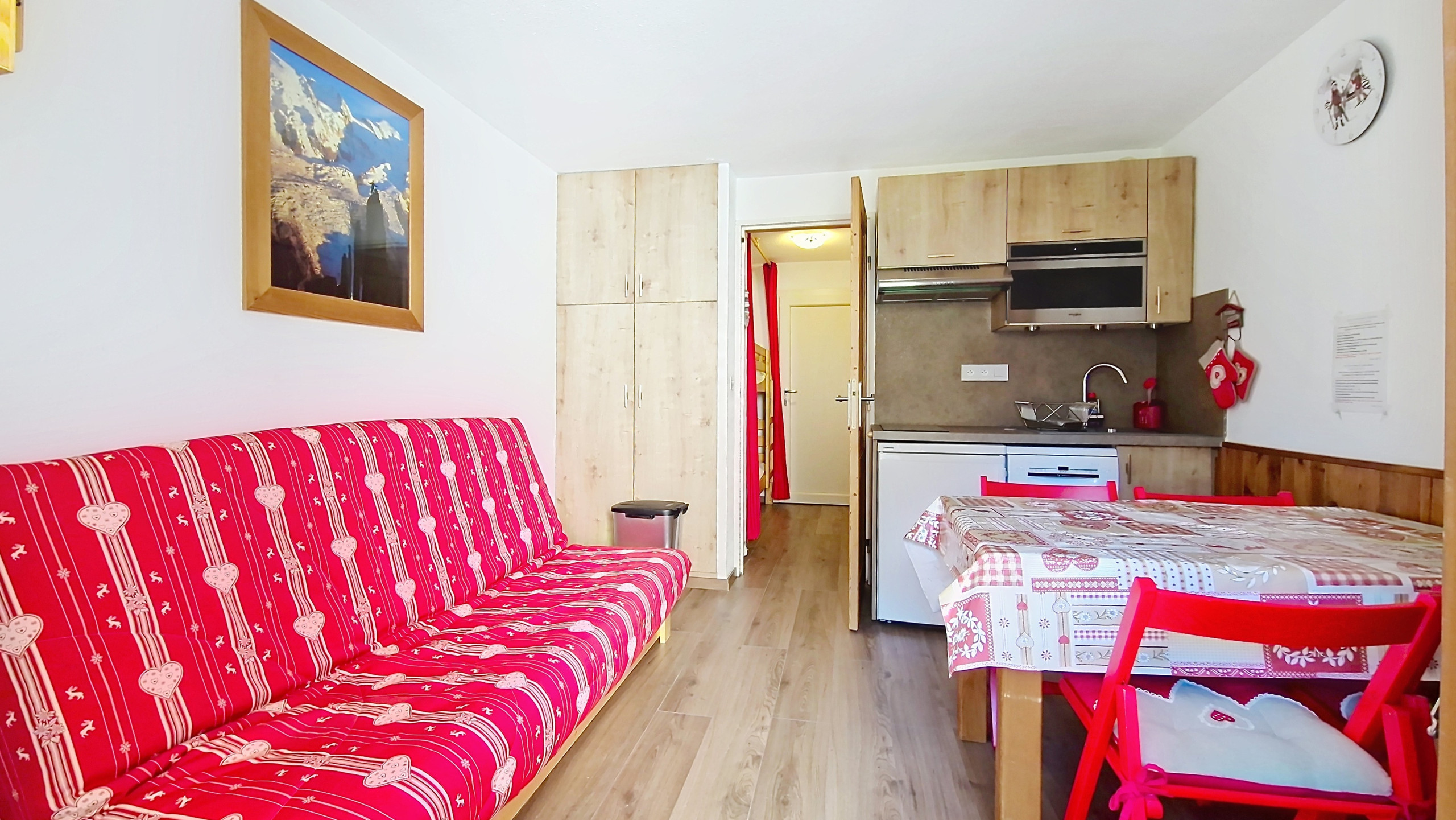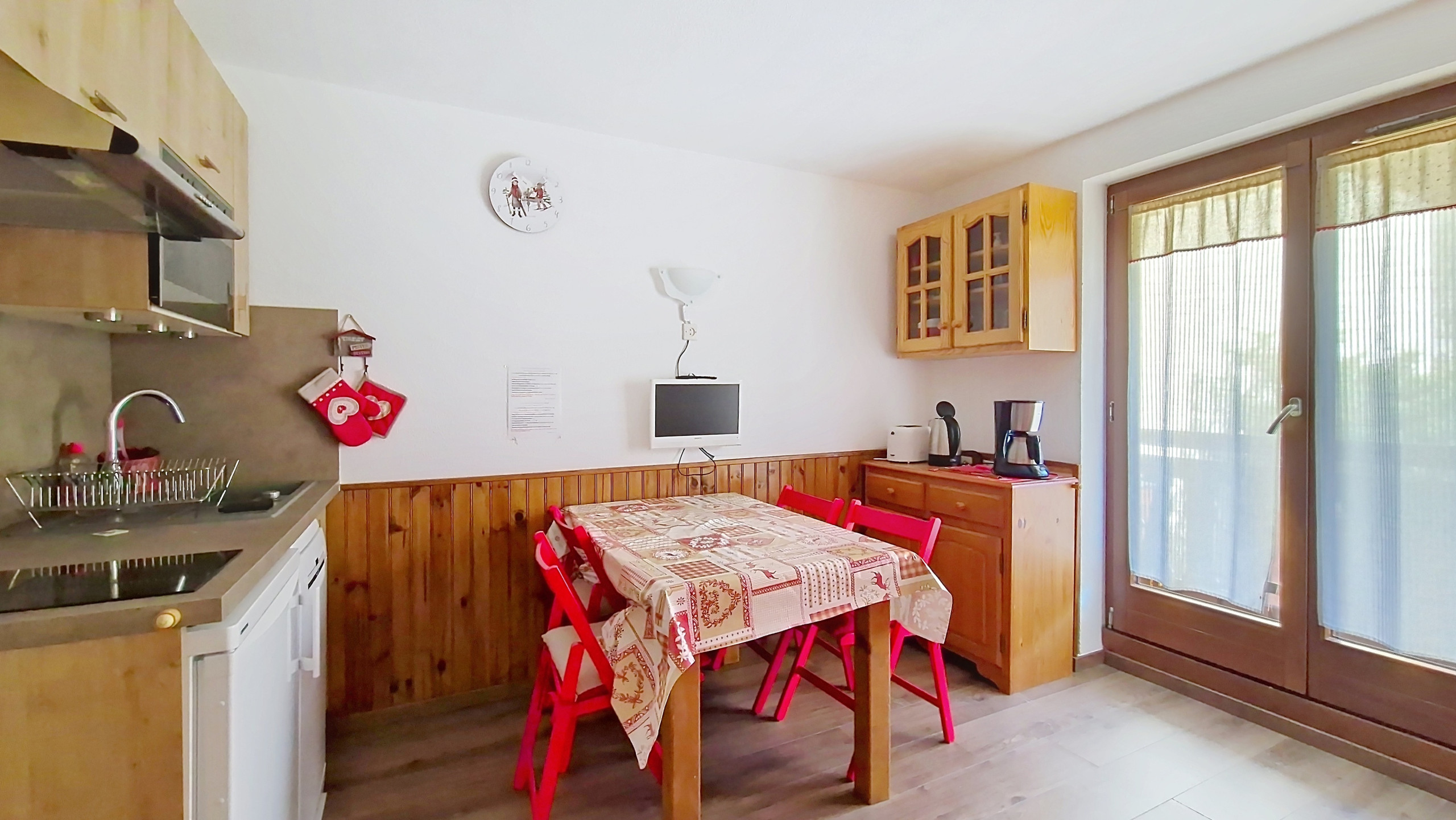 Komfortable 2-Sterne-Wohnung von 19 m2, im Erdgeschoss. Sonniger Aufenthalt im Sommer, Flachbildfernseher. Offene Küche ausgestattet mit Induktionskochfeld, Kühlschrank, Filterkaffeemaschine, Wasserkocher, Mikrowelle, Multifunktionsherd und Toaster.