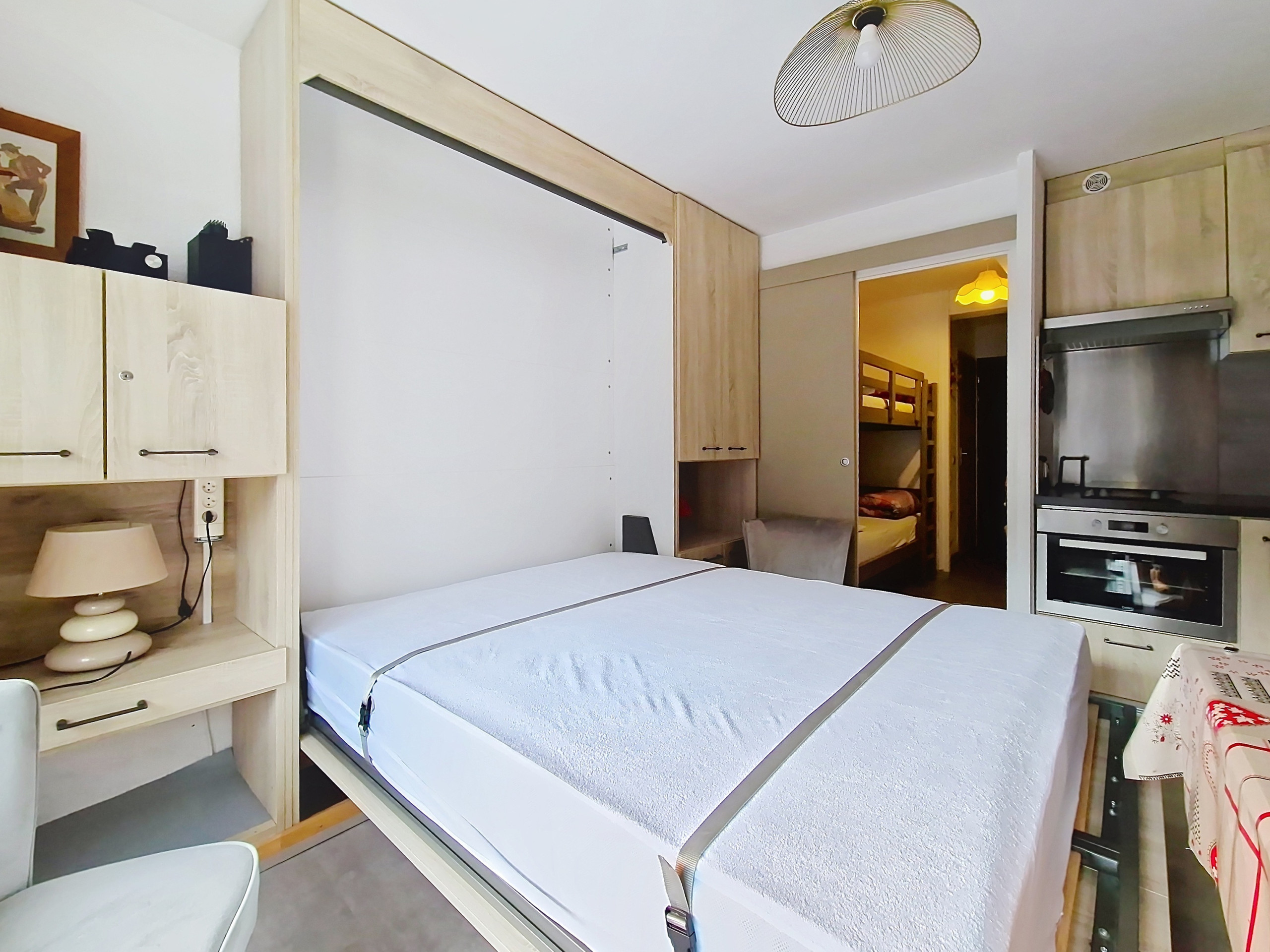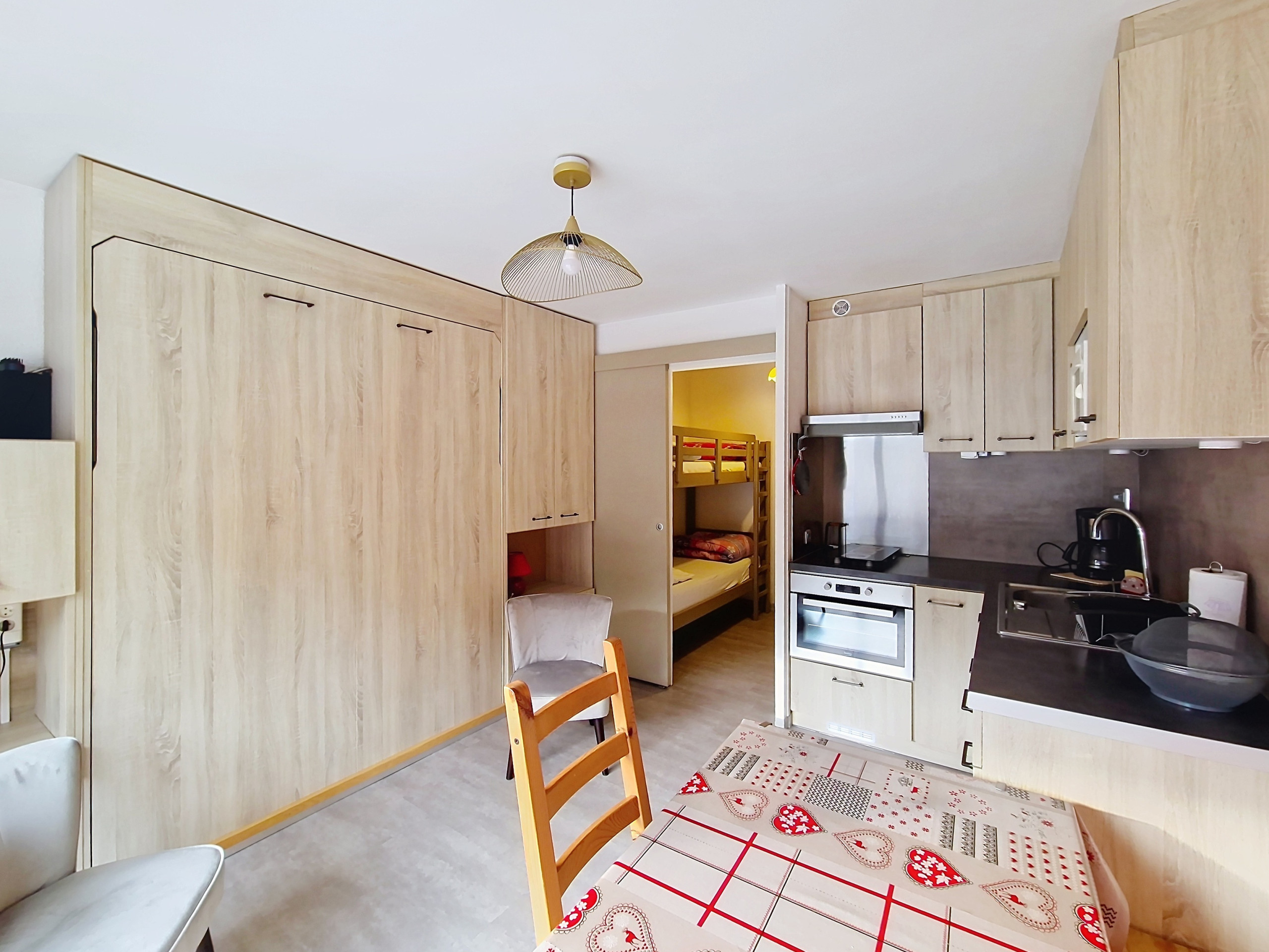 Komfortable 2-Sterne-Wohnung von 19 m2, im Erdgeschoss. Sonniger Aufenthalt im Sommer, Flachbildfernseher. Offene Küche ausgestattet mit Induktionskochfeld, Kühlschrank, Filterkaffeemaschine, Wasserkocher, Mikrowelle, Multifunktionsherd und Toaster.