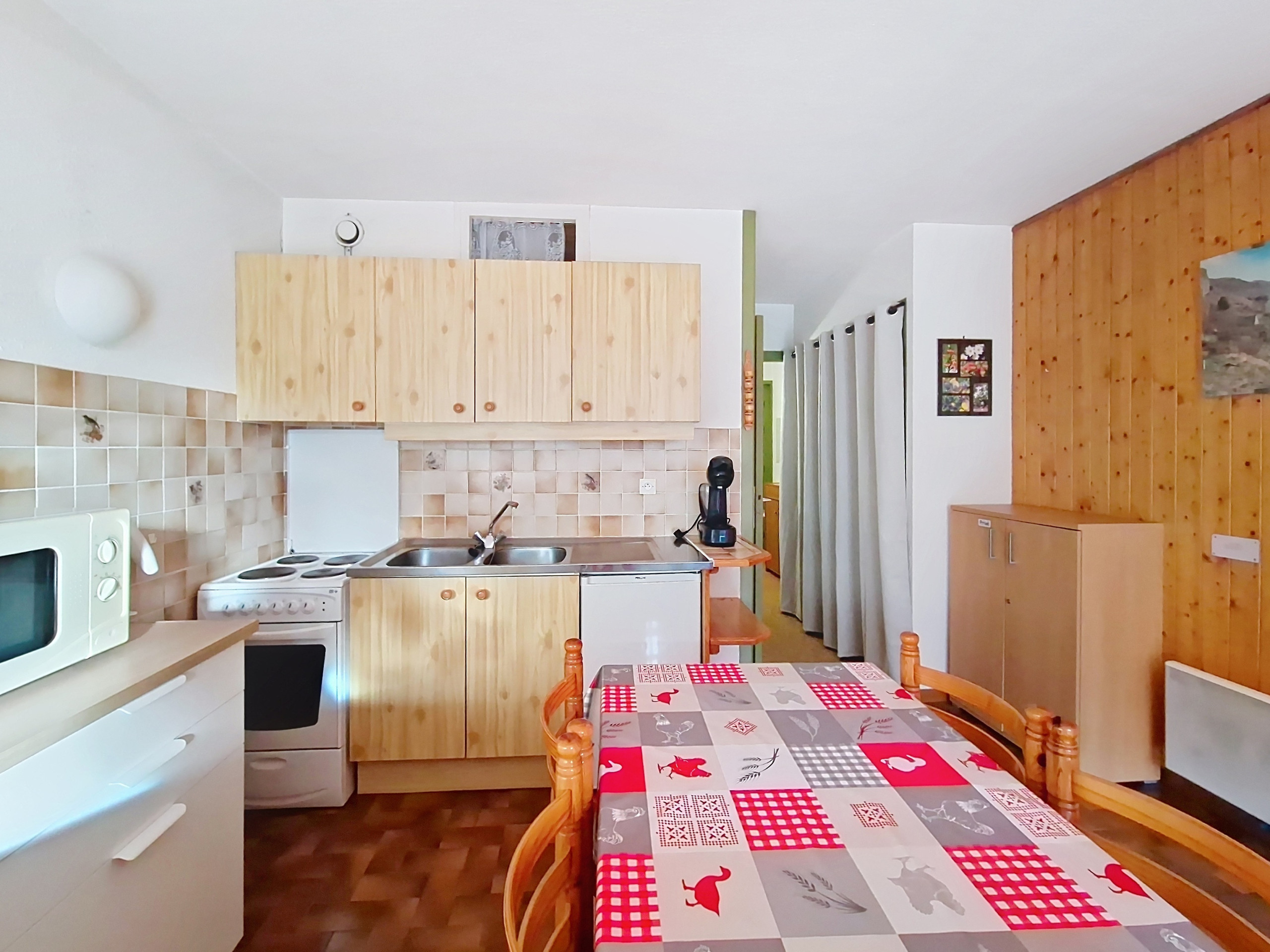 Komfortable 2-Sterne-Wohnung von 19 m2, im Erdgeschoss. Sonniger Aufenthalt im Sommer, Flachbildfernseher. Offene Küche ausgestattet mit Induktionskochfeld, Kühlschrank, Filterkaffeemaschine, Wasserkocher, Mikrowelle, Multifunktionsherd und Toaster.
