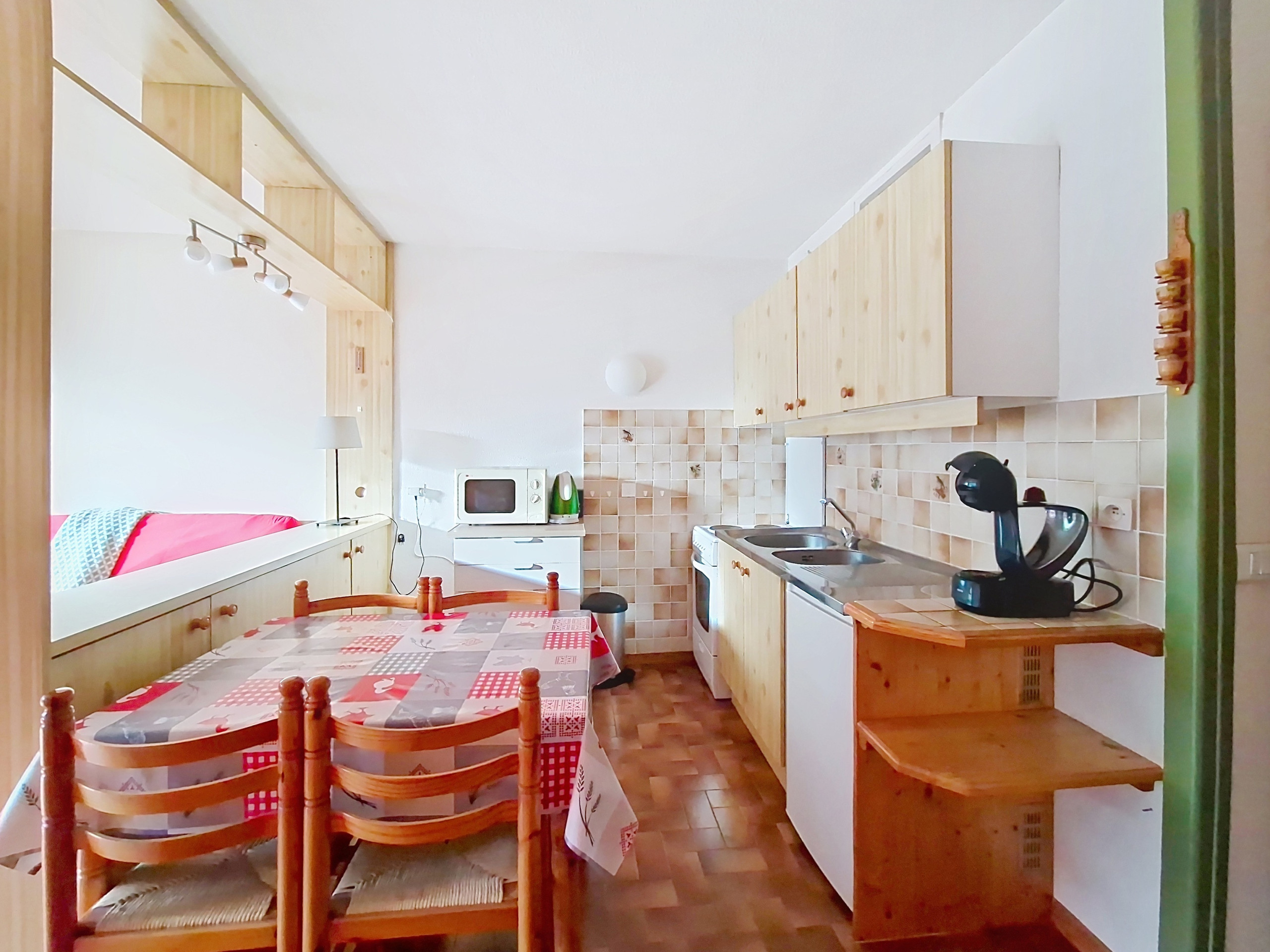 Komfortables 2* Studio von 35 m2 im 2. Stock. Im Sommer sonniges Wohnzimmer, Flachbildfernseher. Offene Küche mit Elektroherd, Kühlschrank, Dolce-Gusto-Kaffeemaschine, Wasserkocher, Backofen, Mikrowelle und Toaster.