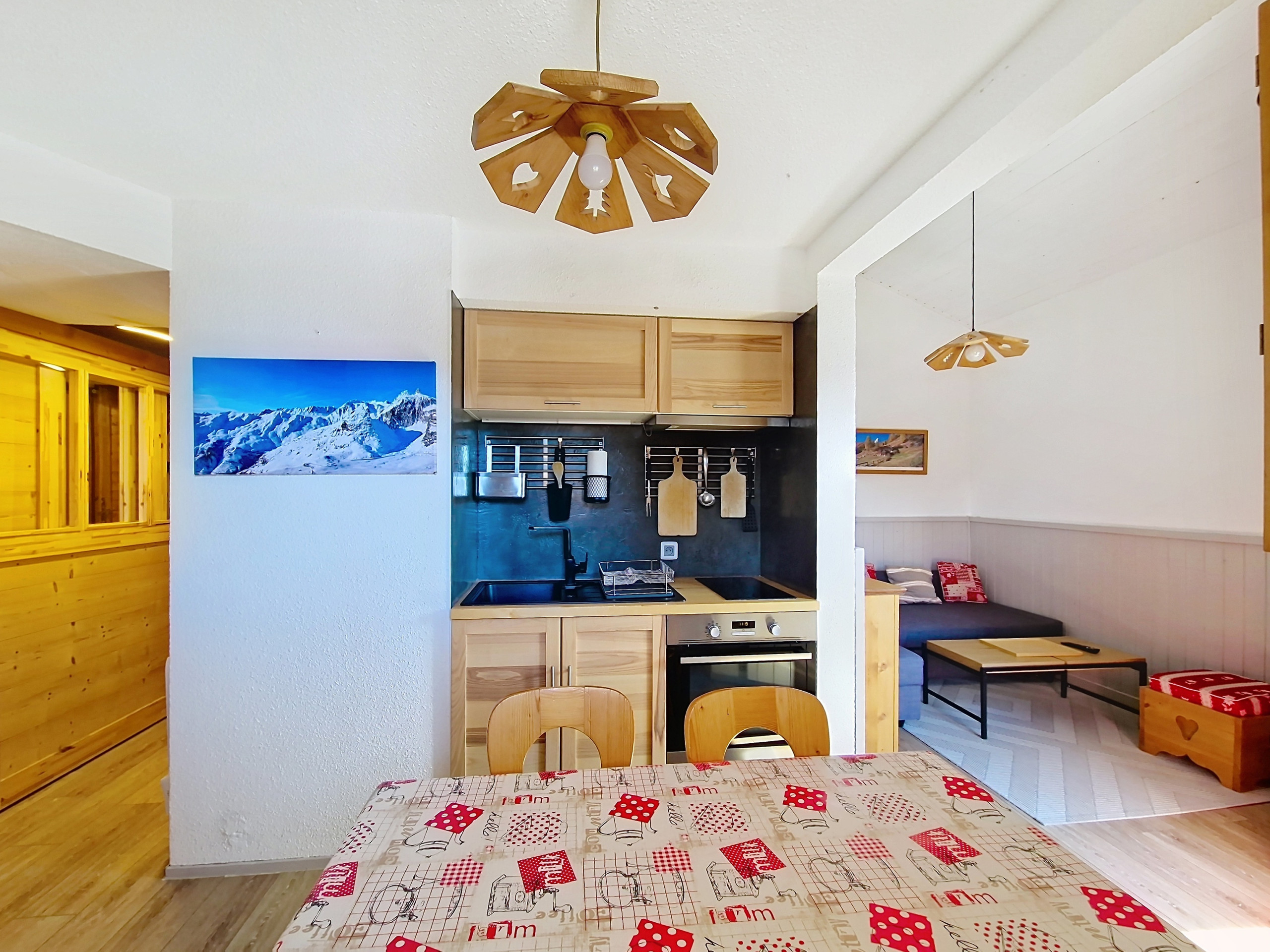 Comfortabel 2-sterren appartement van 24 m2 op de 1e verdieping. Zonnige woonkamer in de zomer, flatscreen-tv met kabelzenders. Open keuken uitgerust met keramische kookplaat, koelkast, filterkoffiezetapparaat, waterkoke, oven en broodrooster.