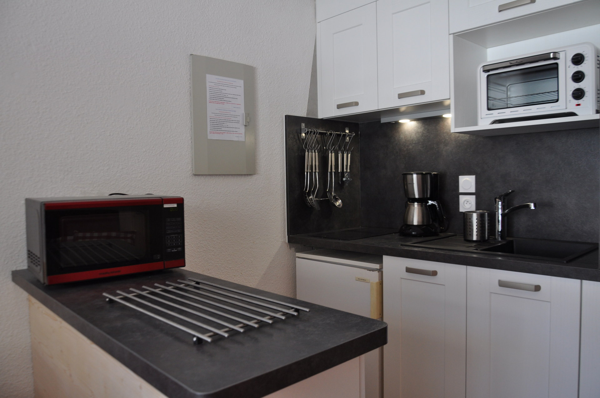 Comfortabel 2-sterrenappartement van 28 m² op de 2e verdieping. Woonkamer met flatscreen-tv met kabelzenders. Open keuken met koelkast, keramische kookplaat met 2 pitten, filterkoffiezetapparaat, mini-oven, waterkoker, magnetron en broodrooster.