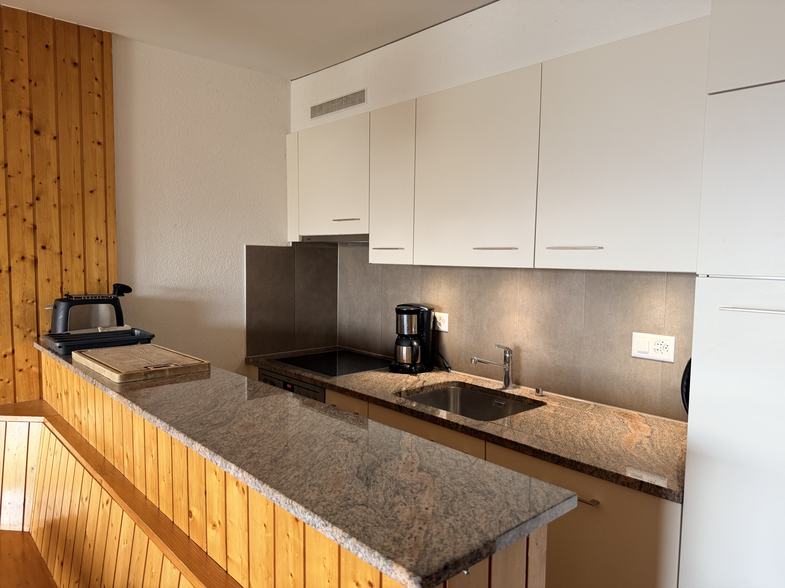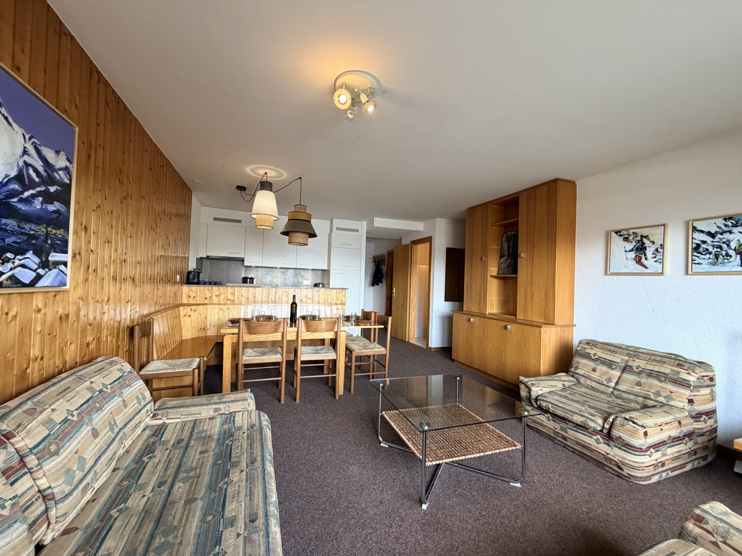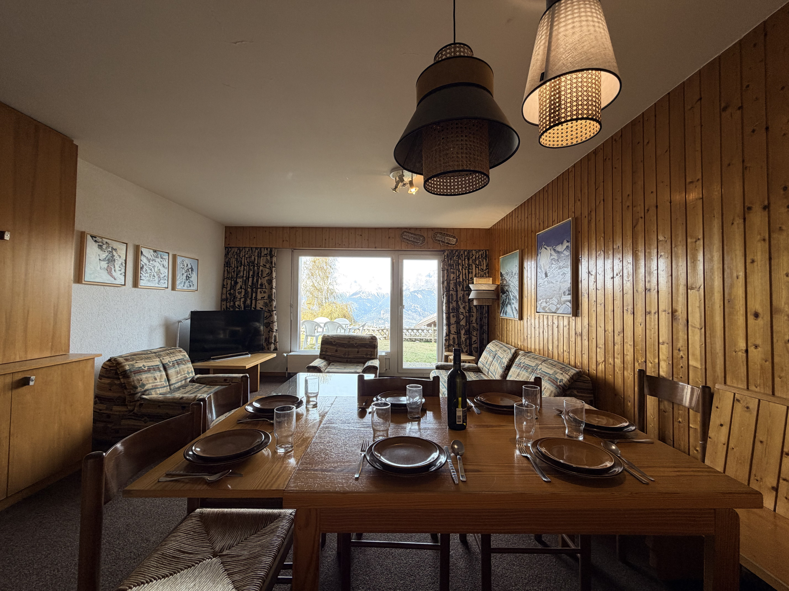 Groot appartement voor 5 personen van 70 m² op één verdieping op de begane grond van een chalet. Zonnige woonkamer met slaapbank en decoratieve open haard. Open keuken uitgerust met keramische kookplaat, koelkast, oven, magnetron, vaatwasser, waterkoker, sapcentrifuge, CoffeeB-koffiemachine, broodrooster, fondueset en raclette-apparaat.