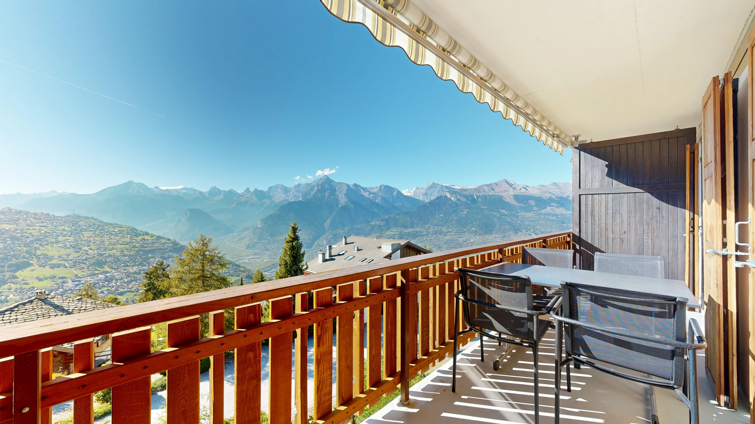 - Buiten: balkon met tuinmeubilair en uitzicht op Nendaz