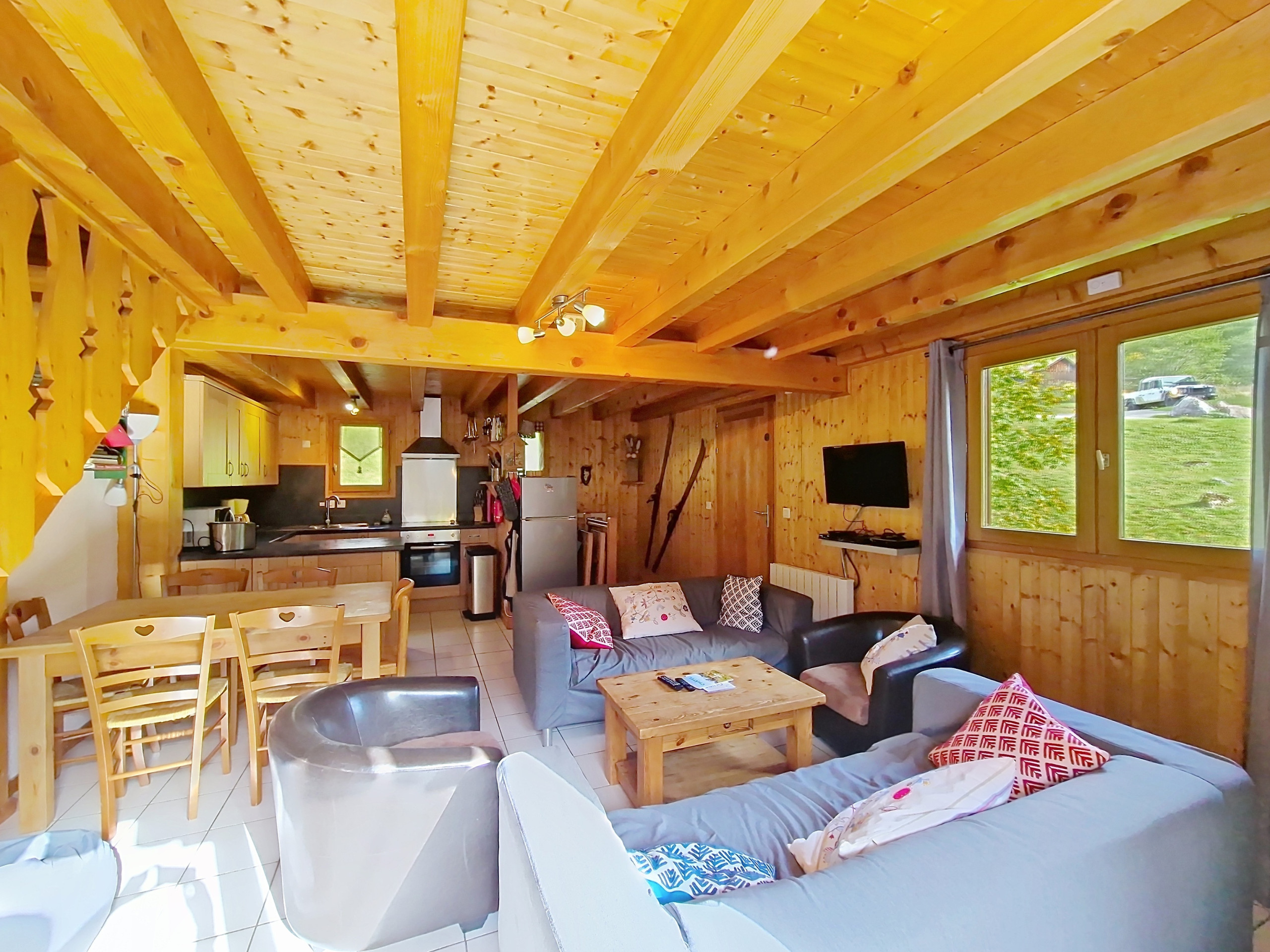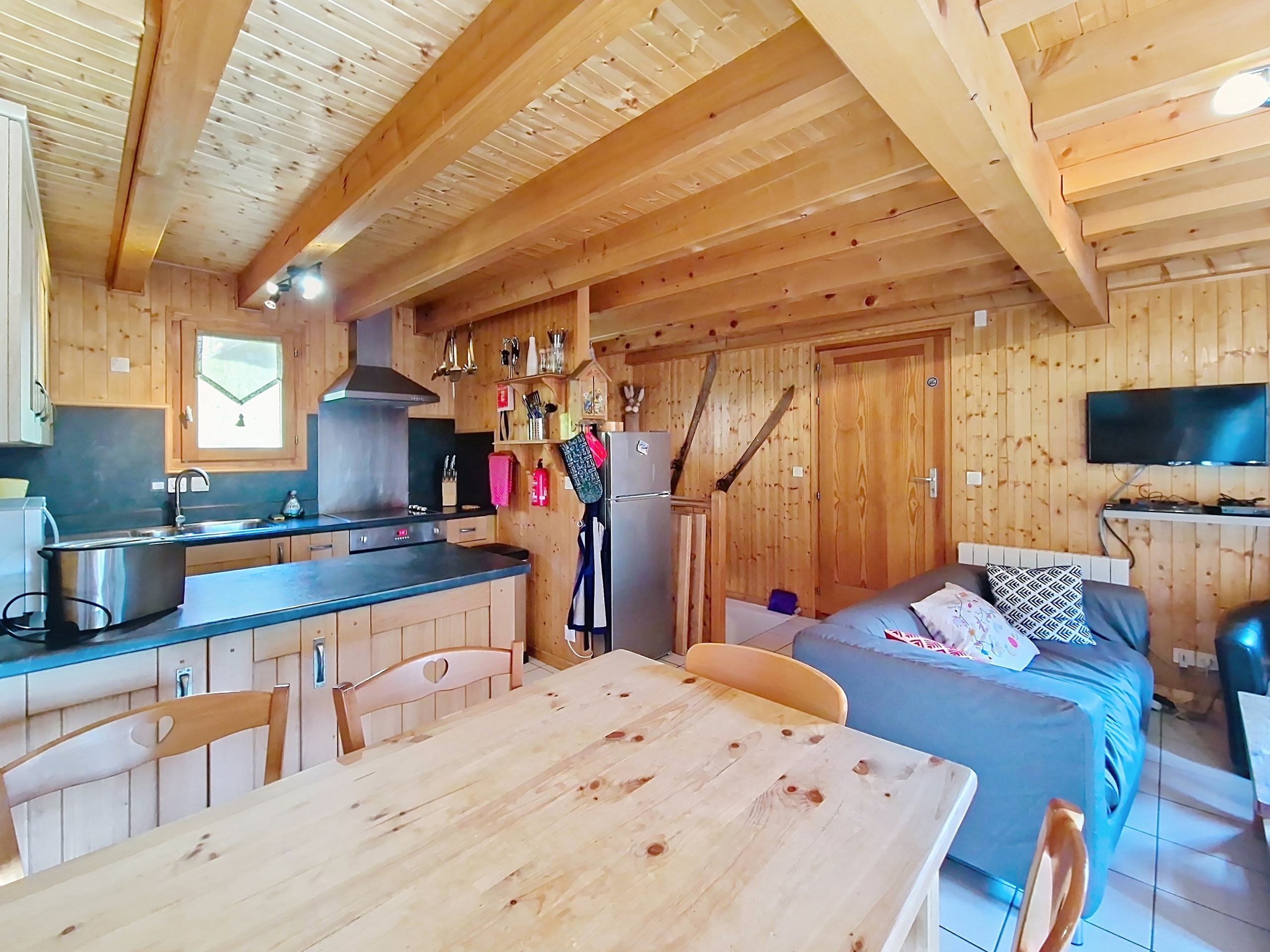 Chalet gelegen tussen Le Linga en Pré la Joux, comfortabel 2* 90 m2, op 3 niveaus. Zonnige woonkamer in de zomer, flatscreentelevisie. Open keuken uitgerust met keramische kookplaat, koelkast, kleine vriezer, filterkoffiezetapparaat, waterkoker, oven, magnetron en broodrooster.