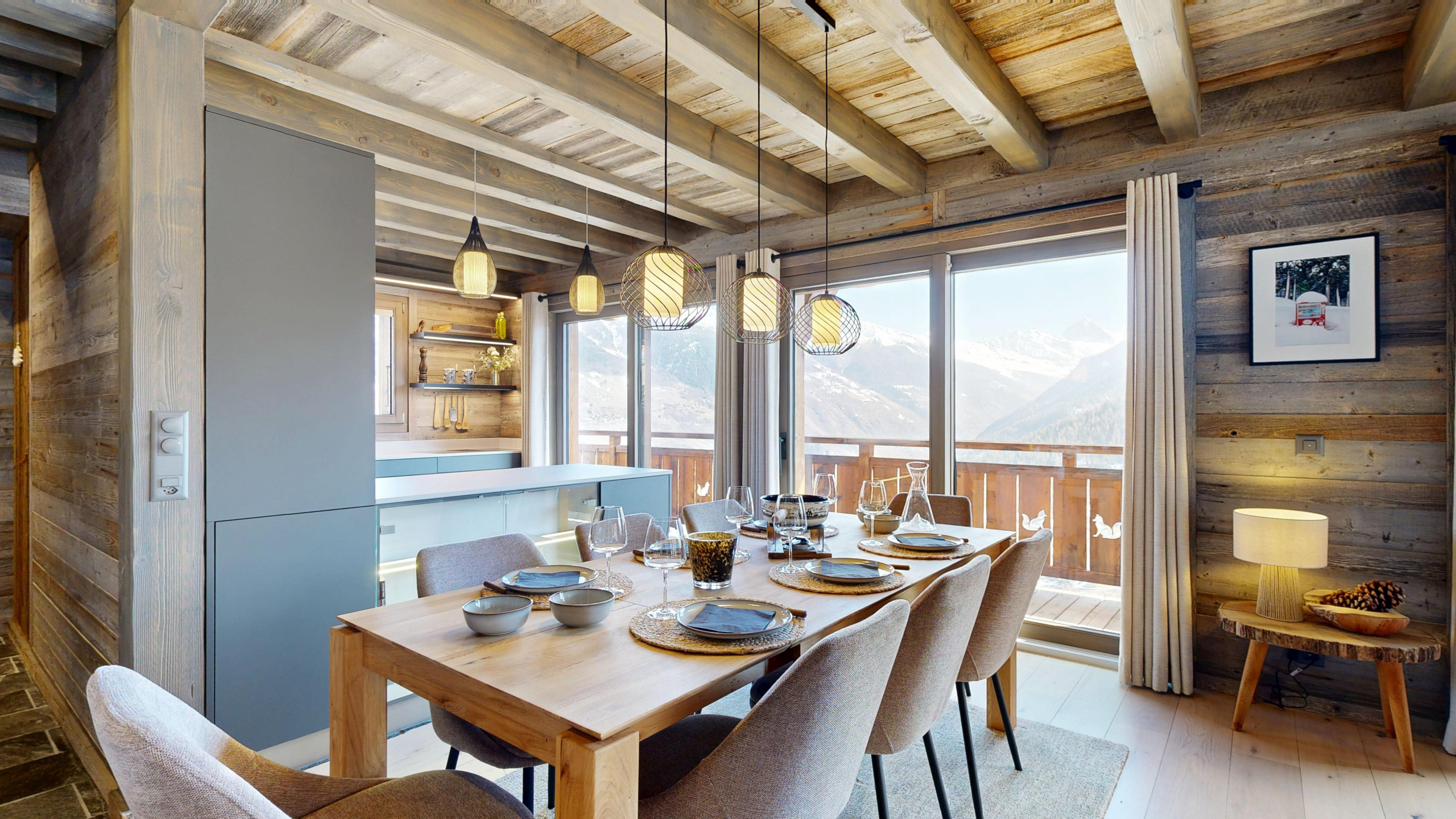 Luxe 5*-chalet voor 8 personen, 165 m². Lichte woonkamer met open haard, flatscreen kabel-tv en wifi. Volledig uitgeruste keuken met koelkast, vriezer, oven, vaatwasser, magnetron, Nespresso-koffiemachine, waterkoker, broodrooster, fondueset en raclette-set.