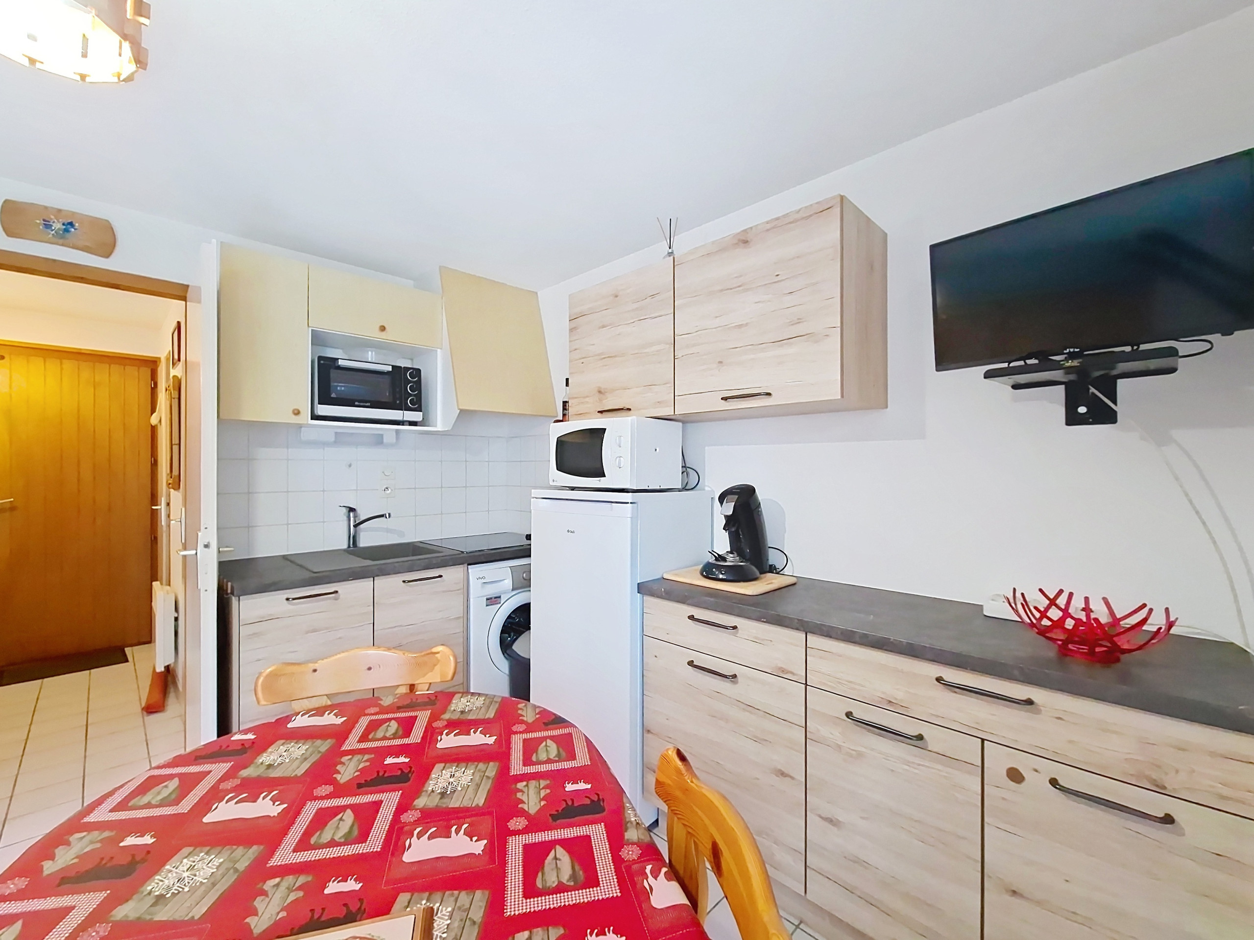 Appartement confortable 2* de 28 m2. Séjour ensoleillé en période estivale, télévision à écran plat. Cuisine ouverte équipée avec plaques électriques, frigo, congélateur, cafetière Senseo et à filtres, bouilloire, four, micro-ondes et grille-pain.