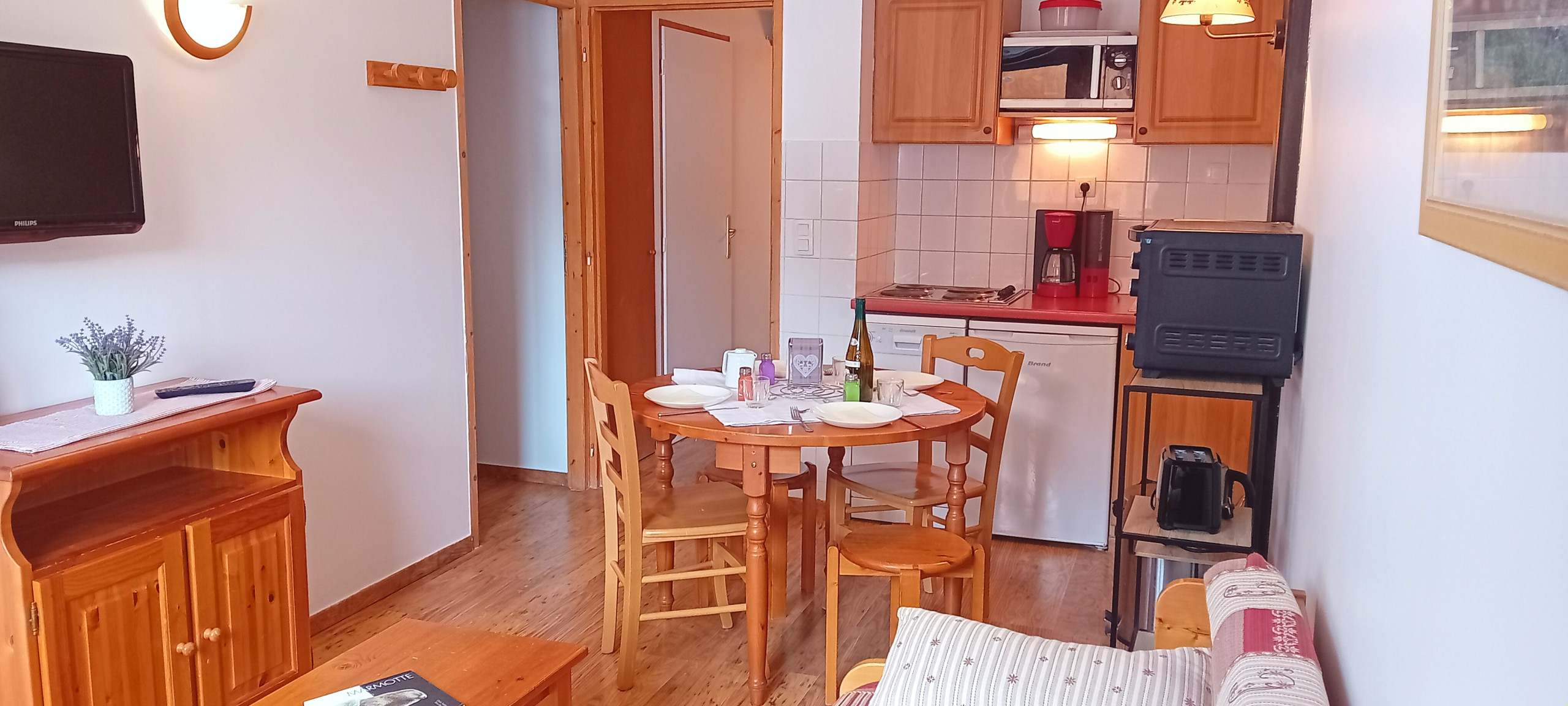 Appartement confortable 3* de 28 m2 au premier étage. Séjour ensoleillé en période estivale, télévision à écran plat. Cuisine ouverte équipée avec plaque à induction, frigo (sans partie congélateur), lave-vaisselle, une cafetière Senseo et une cafetière à filtre, bouilloire, micro-ondes et grille-pain.