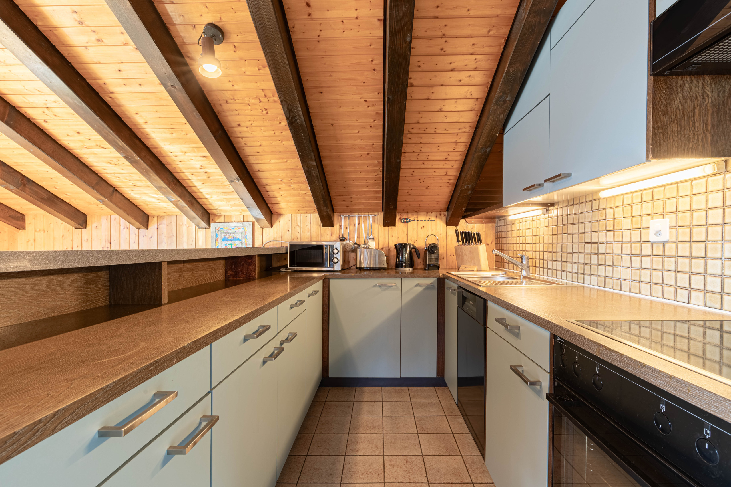 Appartement fonctionnel pour 8 personnes de 90 m2 avec 5 pièces. Séjour lumineux avec une cheminée décorative, télévision câblée, lecteur DVD. Cuisine ouverte équipée avec un frigo, un congélateur à part, un four, un micro-onde, une machine à café à filtres ainsi qu'une machine Nespresso, une bouilloire et un lave-vaisselle.