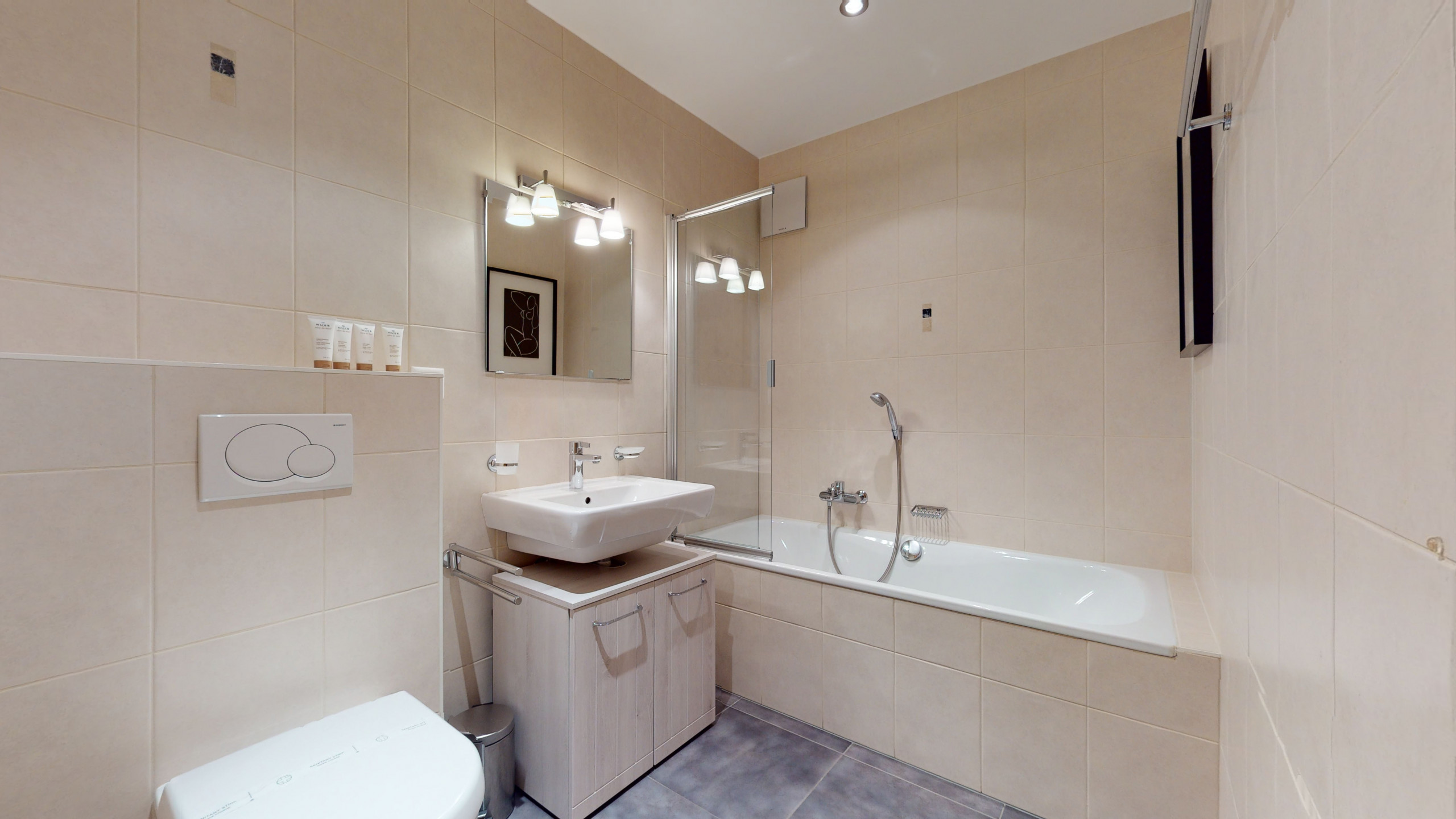 - Salle de bain : 1x avec baignoire et WC, 1x avec douche et WC