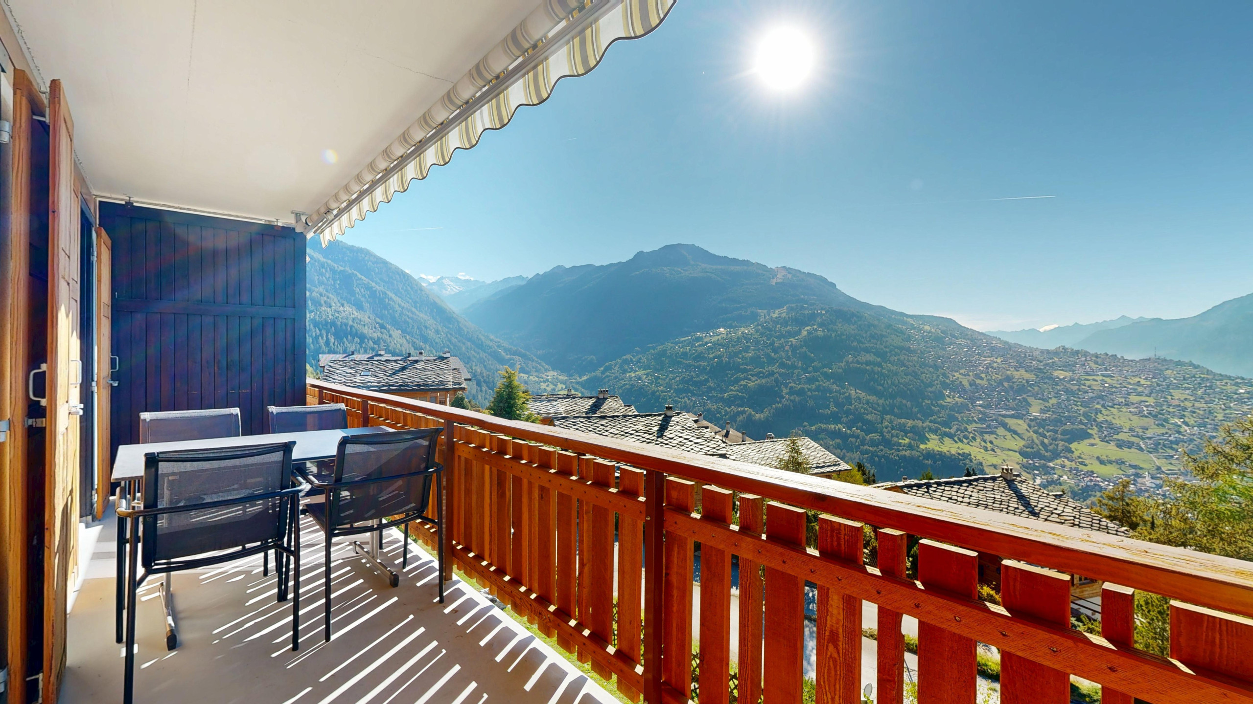 - Extérieur : balcon avec mobilier de jardin et vue sur Nendaz