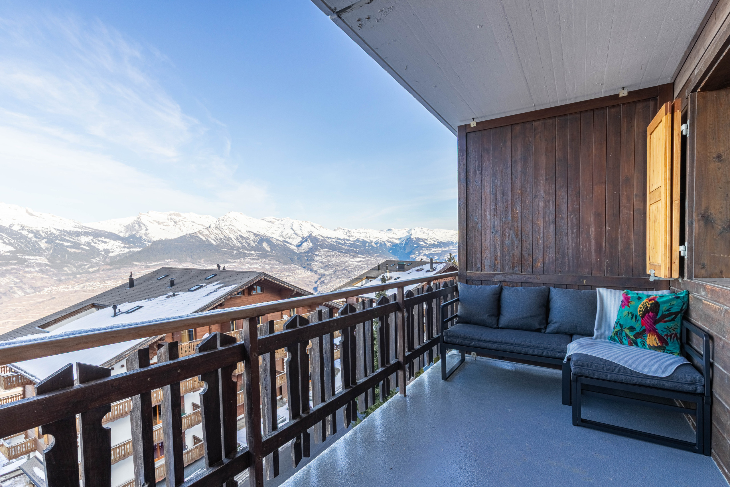 - Extérieur : balcon meublé avec vue sur la vallée du Rhône et angle sur la place de jeux
