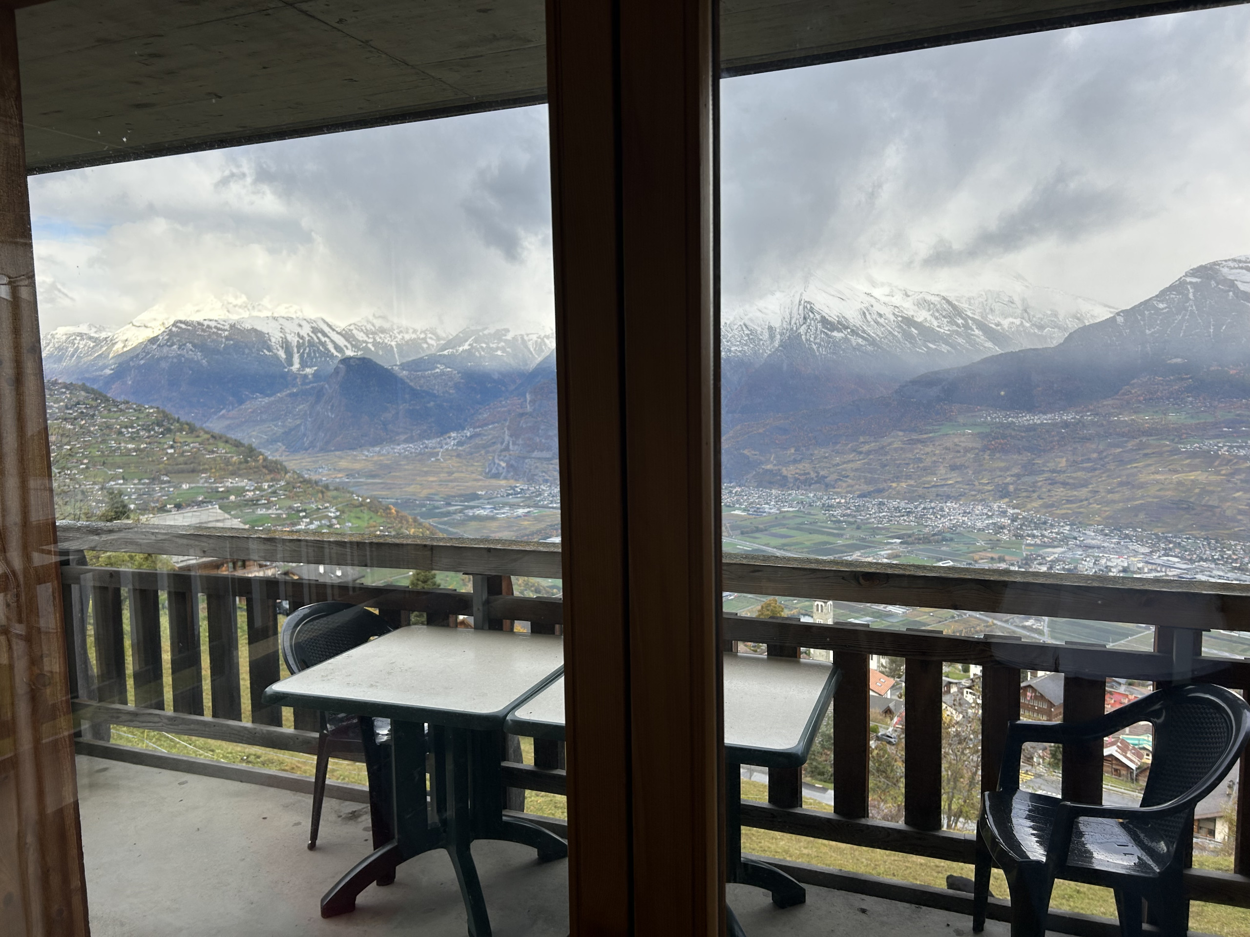 - Extérieur : balcon meublé avec vue sur la vallée du Rhône et angle sur la place de jeux