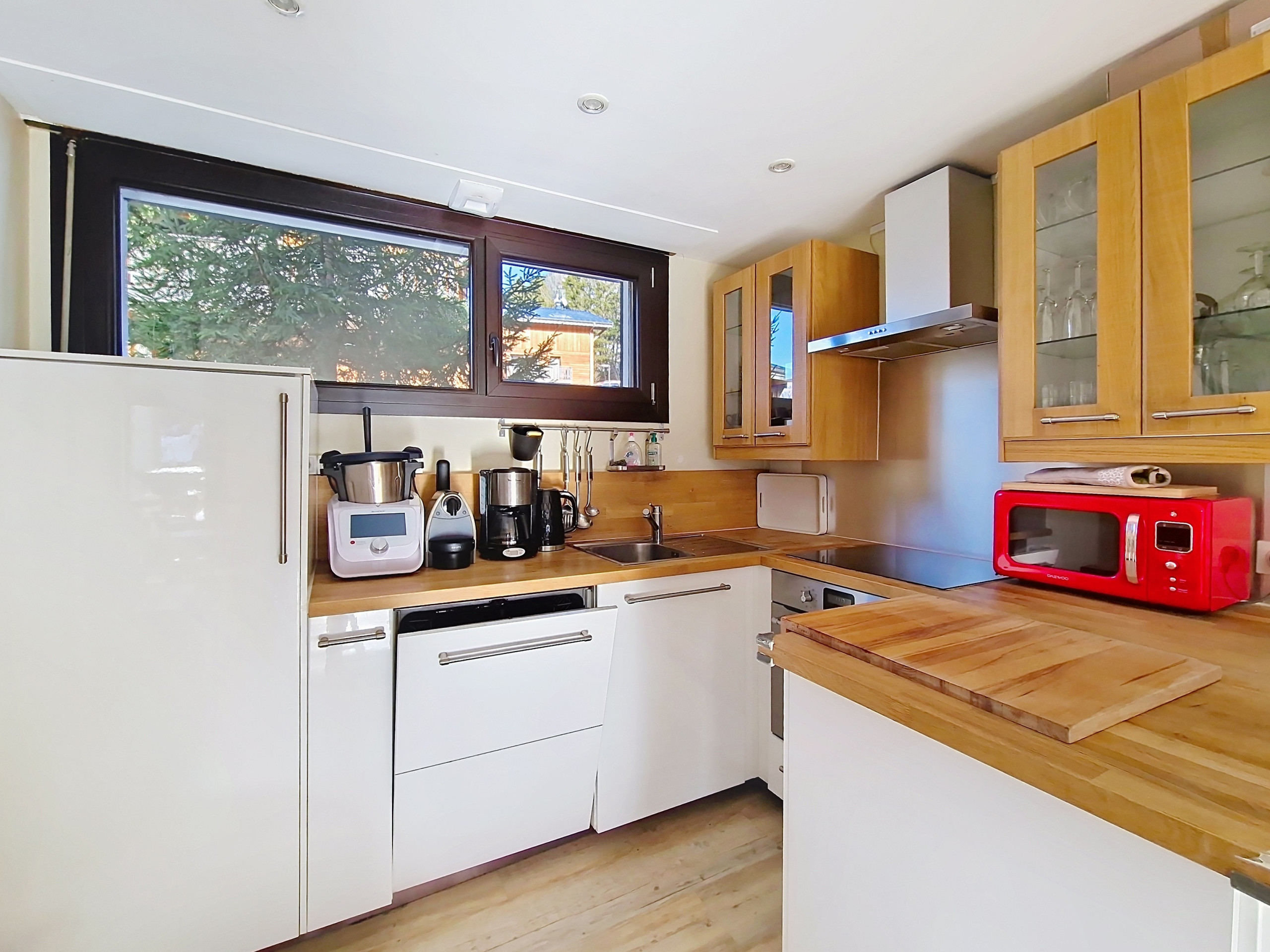 La cuisine américaine, à vitrocéramique, est équipée avec réfrigérateur, micro-ondes, congélateur, lave-vaisselle, vaisselle/couverts, ustensiles/cuisine, cafetière, grille pain et bouilloire.