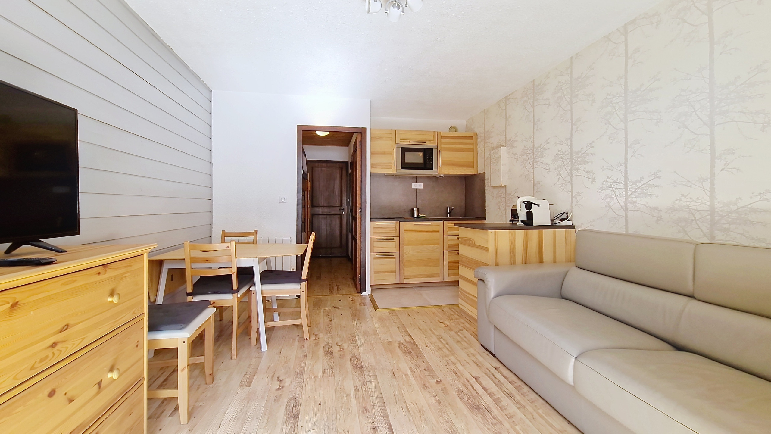 Appartement confortable 2* de 25 m2 au 1er étage. Séjour ensoleillé en période estivale, télévision à écran plat. Cuisine ouverte équipée avec plaques électriques, frigo, cafetière électrique, bouilloire, combiné four/microonde, et grille-pain.