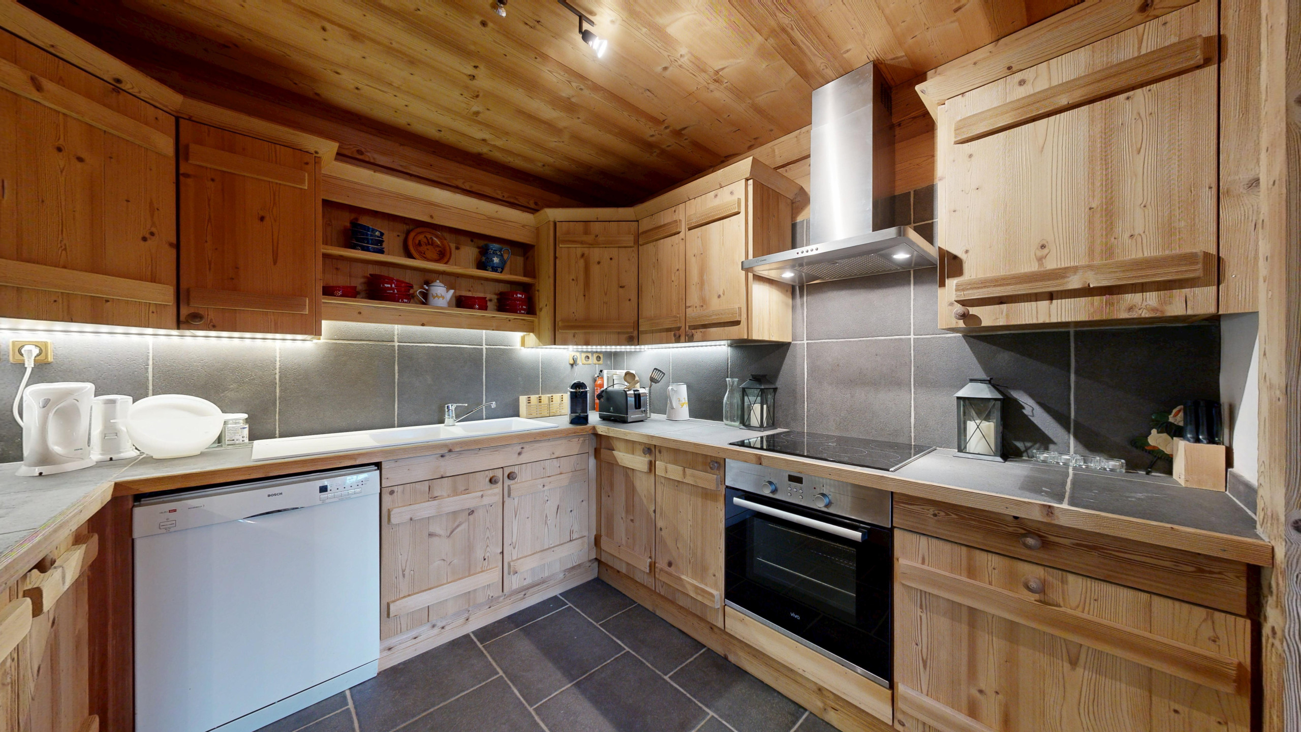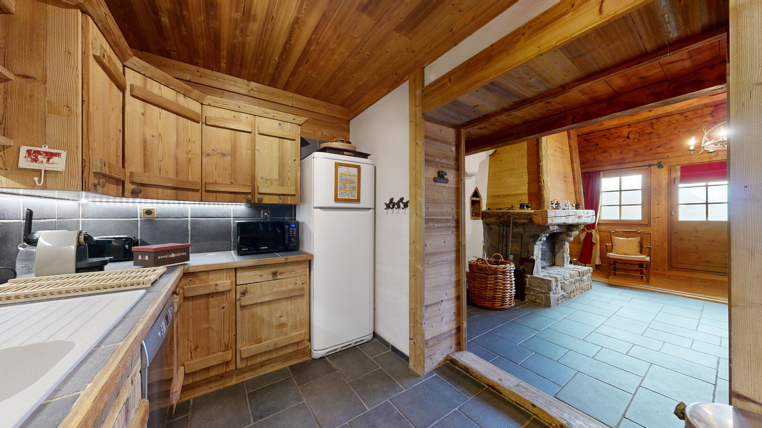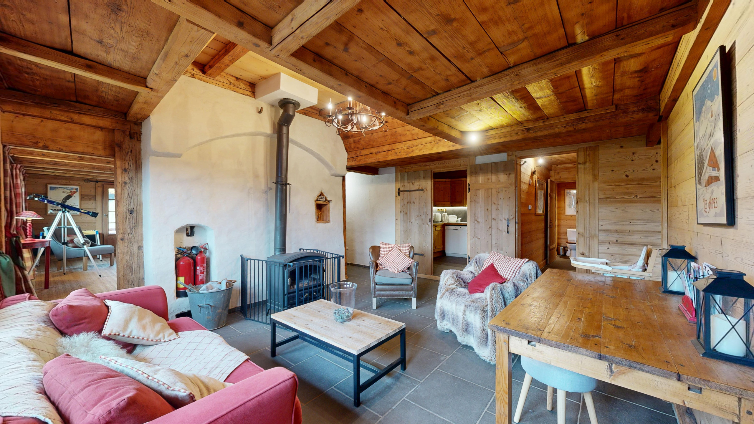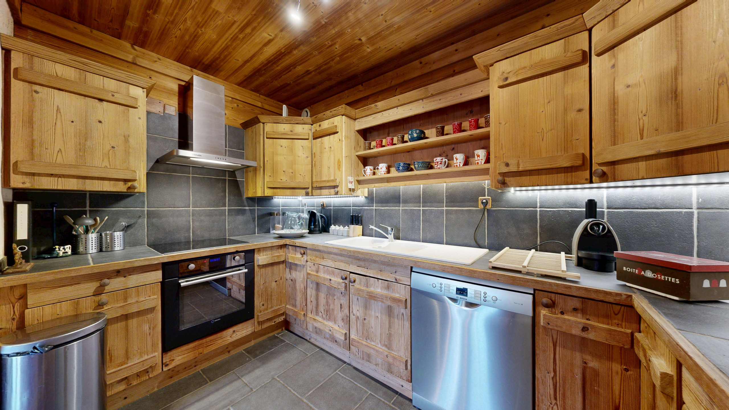 3-star apartment on the ground floor, immerse yourself in a mountain atmosphere in two bright and stylish living spaces, furnished with comfortable sofas, 2 libraries, and a Godin wood stove for cozy evenings. The two fully equipped kitchens are perfect for culinary enthusiasts, featuring modern amenities such as ceramic hobs, ovens, dishwashers, refrigerators, toasters, coffee makers, kettles, as well as a fondue set, raclette machine, pancake griddles, juicer, and a pierrade grill. Outside, there is a terrace and a large garden.