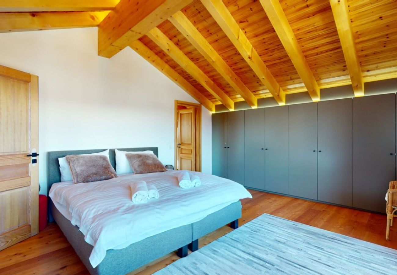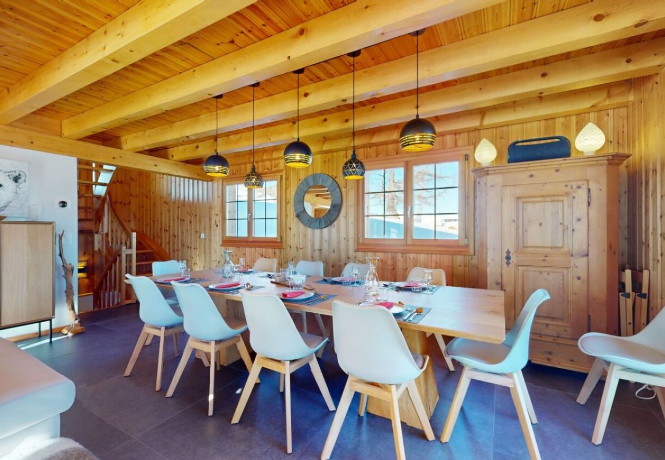 Large, fully renovated 5* chalet, 200 m2, south-facing, very bright. Quality furniture and bedding. With its 5 bedrooms (4 double rooms and a large dormitory), it can accommodate up to 14 people. Underfloor heating on all floors.